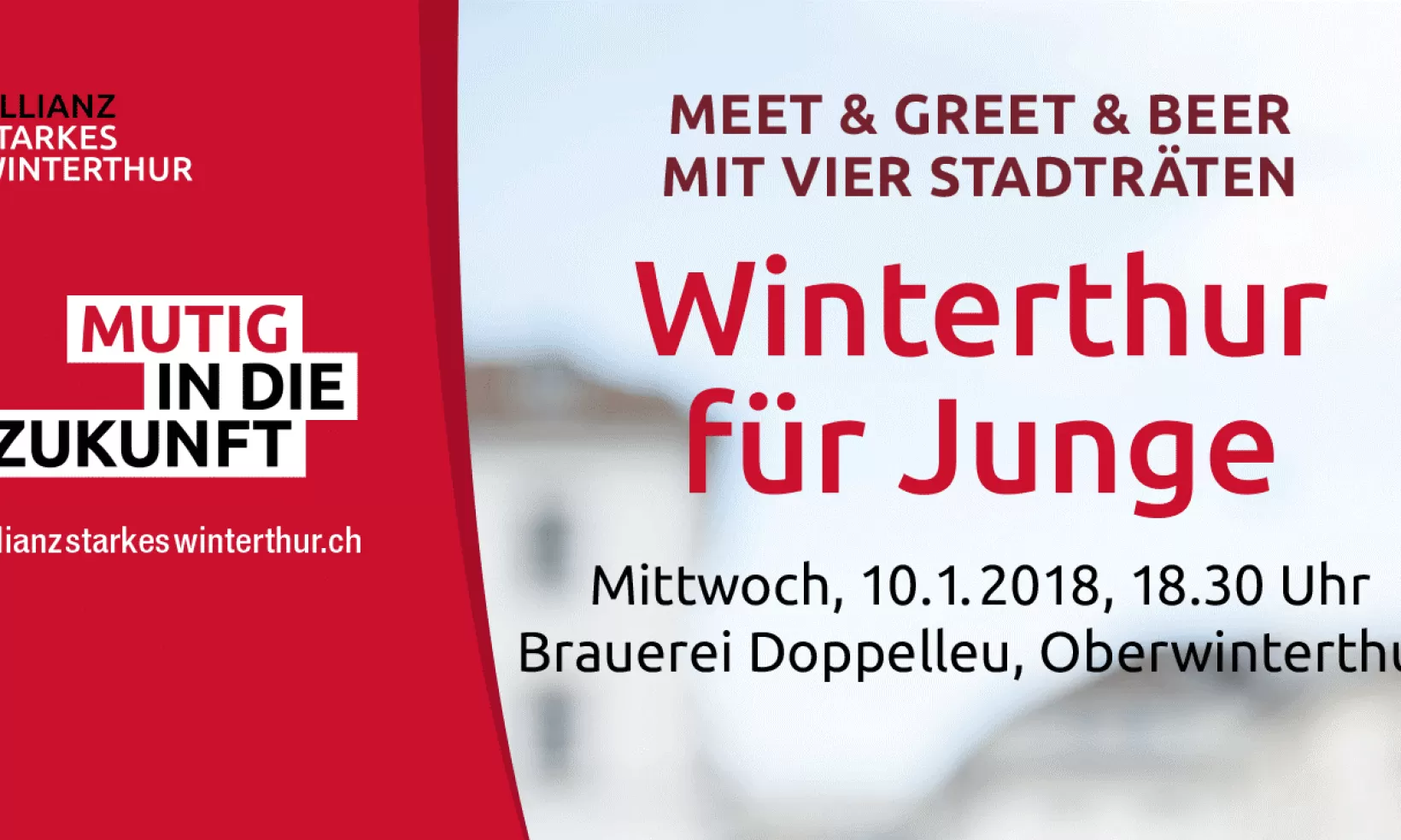 Der Eintritt ist frei. Anmeldungen zum Polit-Apèro sind erwünscht bis am Freitag, 5. Januar 2018, unter https://www.allianzstarkeswinterthur.ch/events-1/winterthur-fur-junge-meet-greet-beer-mit-vier-stadtraten/form